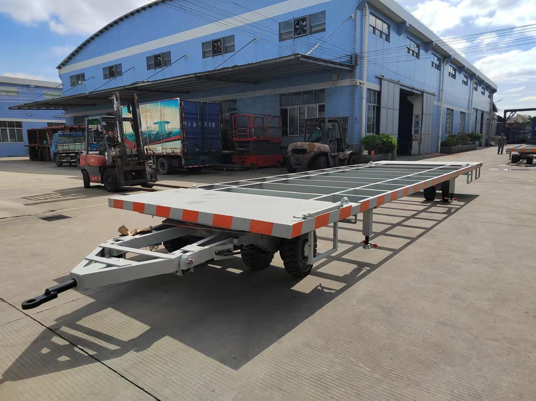 整车采用镀锌管焊接,前车为骨架式,前端带有存放风管的篮筐,拖车四周边可装配缠绕电缆的挂架(可拆)和电缆的移动轮座,挂架及移协轮座的挂钩采用304材料;平板拖车配置螺旋机械支腿,存放风管的篮筐镀部铺铝质漏水花纹板,前后采用固定栅栏,左右两侧设置可前后摆动的双扇栅栏门,配置踩踏板;本拖车用于机场运输设备及各类物资。