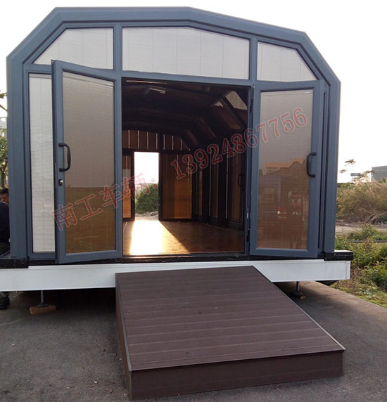 南工移动阳光房底盘件为全挂式结构,采用转盘式回转总成,可180度最小半径转向。拖车顶盘包边采用铝蜂窝板,表面美观、大方。底盘内置移动房车空调,舒适度高。采用全自动液压支腿,自动化强,高档美观。
